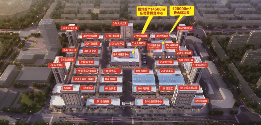 中农联梧州项目作为第五代智慧型农产品交易市场,总占地184亩,总建筑面积25万平方米,总投资20亿元人民币。是一个现代化、信息化、专业化、智能化的大宗农产品交易集散中心。项目搭载了“云仓配”智能模式、区块链、云支付、互联网大数据平台、涉农电商平台、运营一体化等先进技术,以智慧科技驱动产业整合和行业升级,打造全方位、全体系、全物流、全网络的农产品交易总部基地,成为整合上下游资源,物流归集、农业归集、信息化归集、交易流通归集等一站式的全国农副、农特产品展示展销平台。最终通过与城市形成产业结构互补,产城融合,提升城市经济发展,增加农民收入,为国家发展三农大计贡献力量。