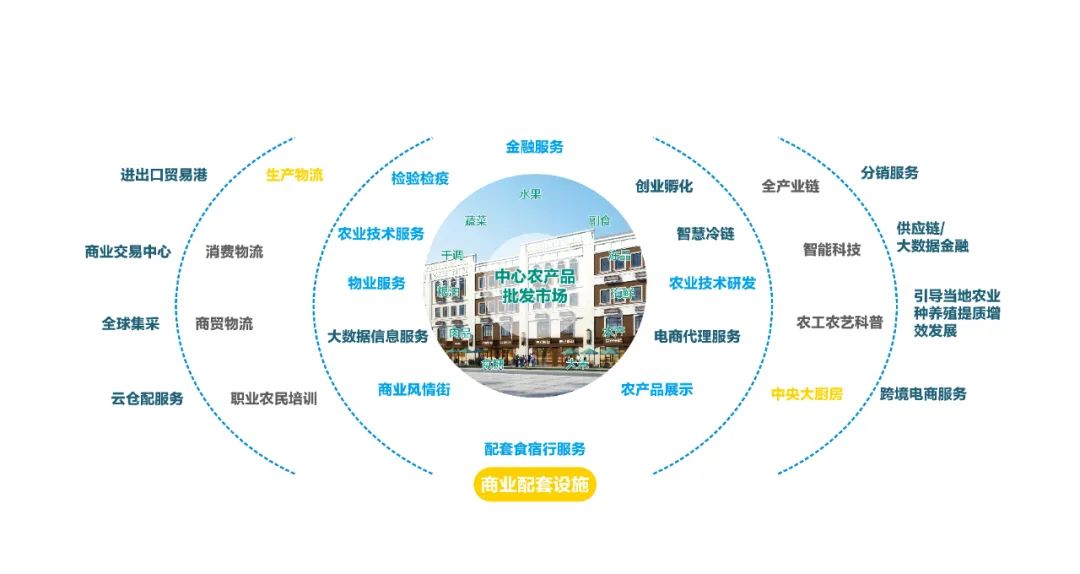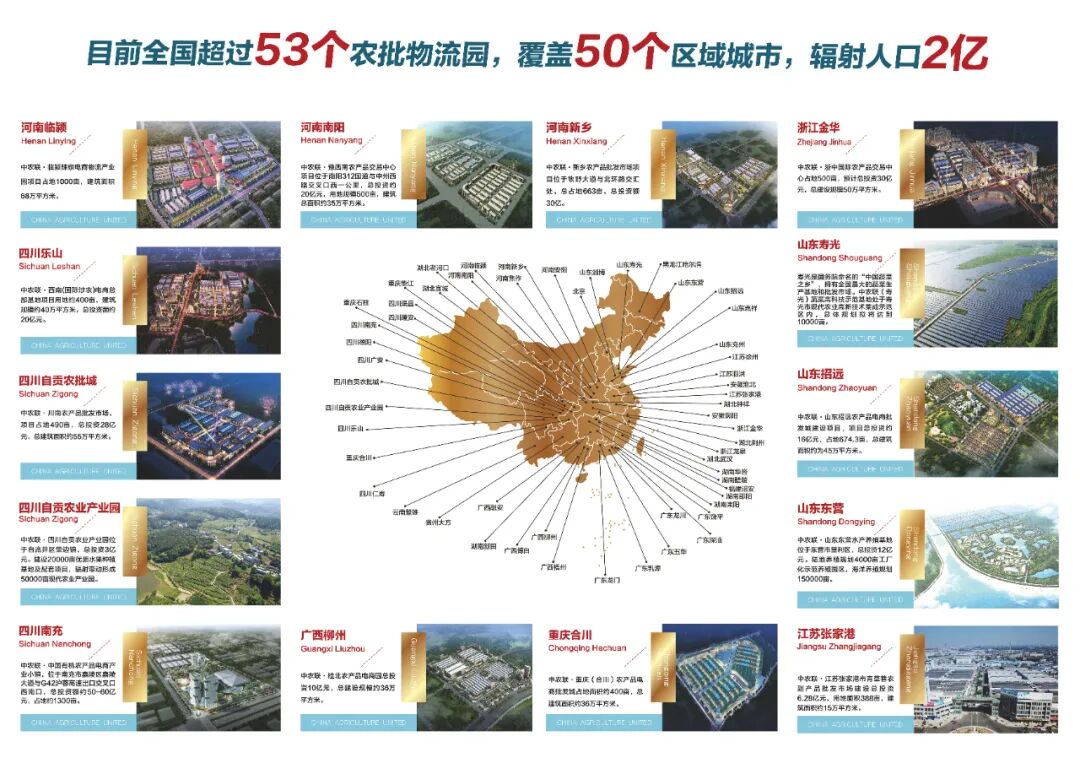 中农联集团以俯瞰全局的战略高度出发,在全国开展涉农现代化流通平台的布局。目前已落地的农产品电商批发物流园超过53个,覆盖50多个区域城市,辐射人口超2亿人。到2030年前完成全国建设100个涉农现代化流通平台的网络布局,实现农副产品“互联互通“”买全国 卖全国,买全球 卖全球”的愿景。