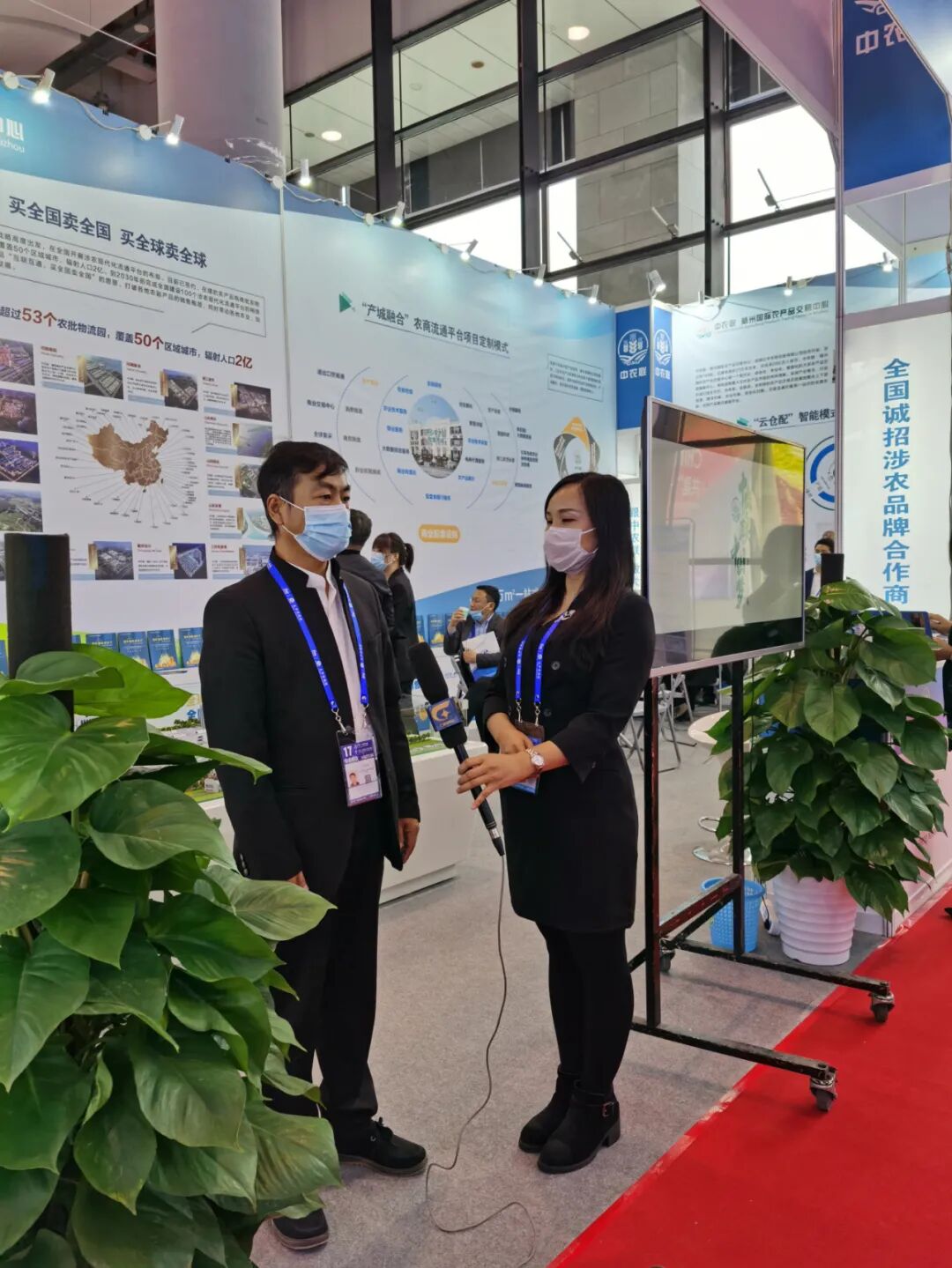 中农联·梧州国际农产品交易中心展厅位于南宁国际会展中心D3馆52号位置,以大气的科技蓝为主色调,两面“L字形”开放迎宾,“25万㎡一站式农产品综合交易市场”、“12万m³云仓储冷库”、“买全国卖全国,买全球卖全球”等突出功能和优点环伺展厅,让每一个经过中农联梧州展厅的展会客商产生了极大的兴趣。